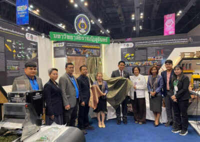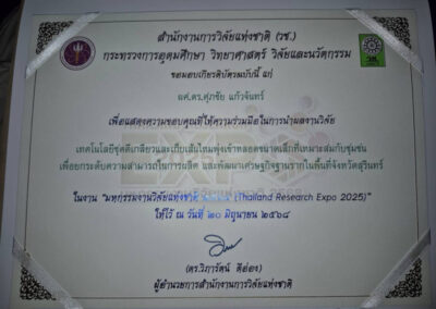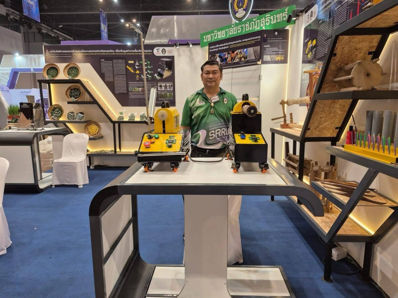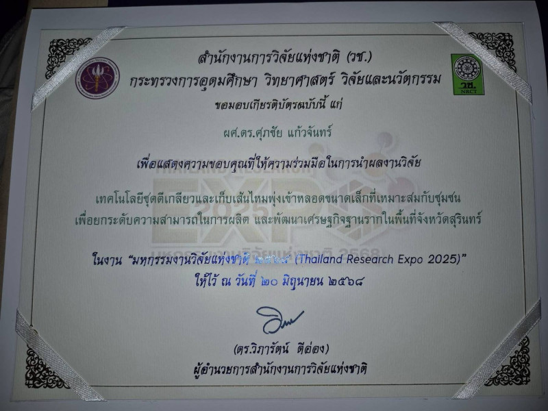 ผลงานวิจัยชิ้นหนึ่งของ ผู้ช่วยศาสตราจารย์ ดร.ศุภชัย แก้วจันทร์ อาจารย์ประจำสาขาวิชาเทคโนโลยีวิศวกรรมเครื่องกลและยานยนต์ไฟฟ้า คณะเทคโนโลยีอุตสาหกรรม มหาวิทยาลัยราชภัฏสุรินทร์ และทีมวิจัย เรื่อง “เทคโนโลยีชุดตีเกลียวและเก็บเส้นไหมพุ่งเข้าหลอดขนาดเล็กที่เหมาะสมกับชุมชนเพื่อยกระดับความสามารถในการผลิตและการพัฒนาเศรษฐกิจฐานรากในพื้นที่จังหวัดสุรินทร์” ได้รับรางวัล “ชมเชย” จากเวทีมหกรรมงานวิจัยแห่งชาติ 2568 (Thailand Research Expo 2025) ในชื่อธีมงาน “วิจัยและนวัตกรรมเพื่อส่งเสริมศักยภาพวิสาหกิจชุมชนและ SME” จัดขึ้นระหว่างวันที่ 16 – 20 มิถุนายน 2568 ณ โรงแรมเซ็นทาราแกรนด์ และบางกอกคอนเวนชันเซ็นเตอร์ เซ็นทรัลเวิลด์ กรุงเทพฯ จัดโดย สำนักงานการวิจัยแห่งชาติ (วช.)