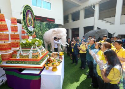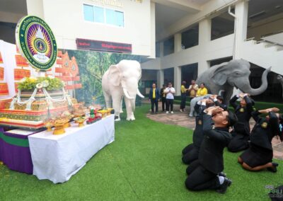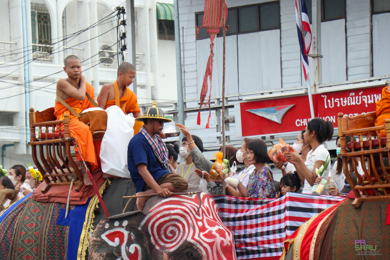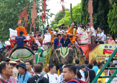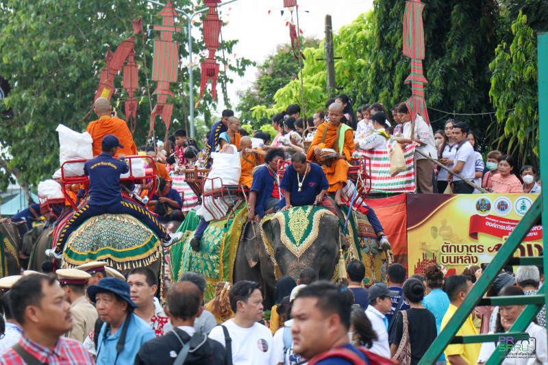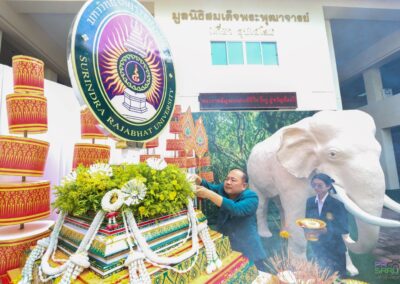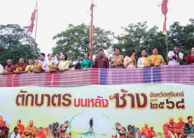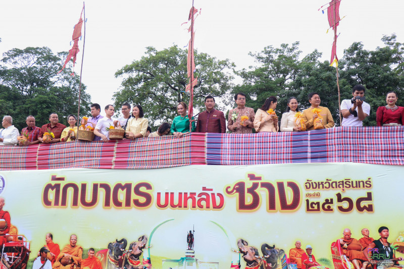 วันที่ 10 กรกฎาคม 2568 เวลา 07.00 น. ผู้ช่วยศาสตราจารย์พรรณราย คำโสภา รองอธิการบดีฝ่ายพัฒนานักศึกษาและพันธกิจสัมพันธ์ เป็นผู้แทนมหาวิทยาลัยราชภัฏสุรินทร์ร่วมในพิธีทำบุญตักบาตรบนหลังช้าง จังหวัดสุรินทร์ ประจำปี 2568 เนื่องในเทศกาลวันอาสาฬหบูชาและวันเข้าพรรษา เพื่อสืบทอดวัฒนธรรมประเพณีอันดีงามของจังหวัดสุรินทร์และส่งเสริมการท่องเที่ยวของจังหวัดสุรินทร์ โดยมีนายชำนาญ ชื่นตา ผู้ว่าราชการจังหวัดสุรินทร์ เป็นประธาน พร้อมด้วยหัวหน้าส่วนราชการ เอกชน ประชาชน และนักท่องเที่ยวชาวไทยและต่างประเทศ ร่วมกิจกรรมอย่างคับคั่ง ณ บริเวณอนุสาวรีย์พระยาสุรินทรภักดีศรีณรงค์จางวาง ต.ในเมือง อ.เมืองสุรินทร์ จ.สุรินทร์